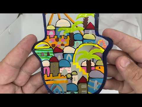 This hamsa depicts the views of Jerusalem, as the artist Emmanuel sees it in his mind's eye.