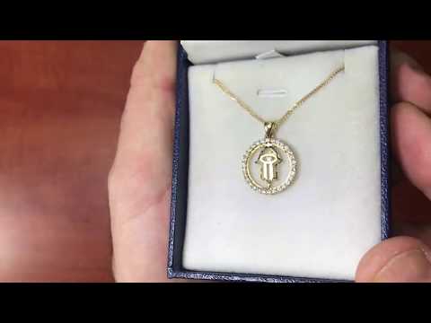 * תליון “חמסה” מזהב צהוב 14 קראט. מסגרת עגולה משובצת קריסטלים לבנים.
