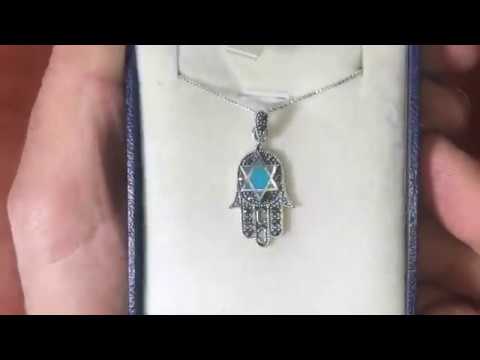 * שרשרת כסף טרלינג 925 עם תליון חמסה עם “מגן דוד” משובץ אבן טורקיז טבעית במרכזה. משובצת עם אבני מרקיז (Marcasite) בעבודת יד עם גימור מעולים.