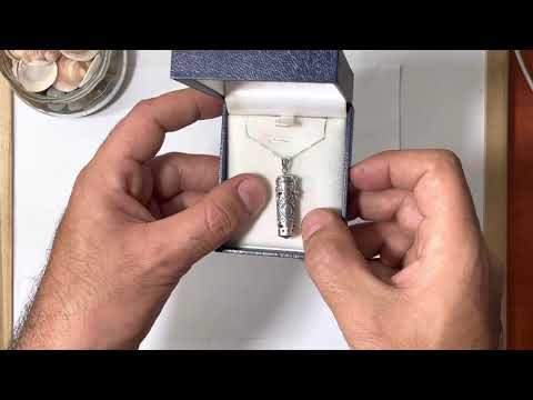 שרשרת מזוזה מכסף 925 עם חמסה בצד אחד ובצד השני להבת האש שלי. כיתוב האש שלי תוקד עד ביאת המשיח סביב לתליון. תליון נפתח ונסגר וניתן להכניס קלף. מגיע עם שרשרת כסף 925 עם שליח עד הבית