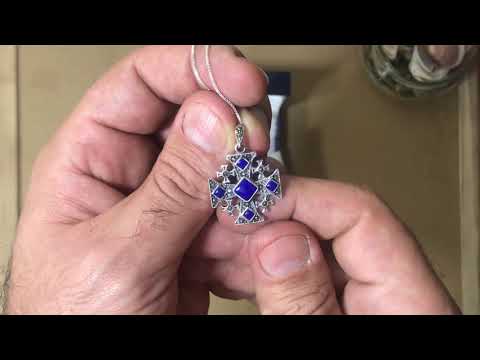 * התליון משובץ 2 סוגי אבנים: אבני לאפיס אמיתי ומרקיזטות (Marcasite) במרכז התליון.